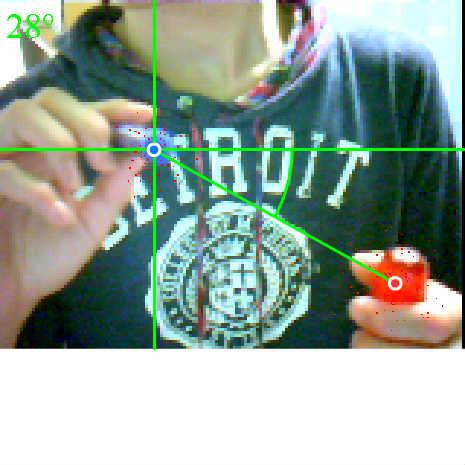 * パーティクルフィルタを使って青い物体と赤い物体を追跡し、2つの物体の画像中の角度を表示します