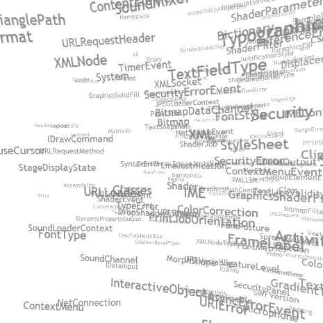 private var tagsString:String ="All Classes Accessibility AccessibilityProperties ActionScriptVersion ActivityEvent AntiAliasType ApplicationDomain ArgumentError arguments Array AsyncErrorEvent AVM1Movie BevelFilter Bitmap BitmapData BitmapDataChannel BitmapFilter BitmapFilterQuality BitmapFilterType BlendMode BlurFilter Boolean BreakOpportunity ByteArray Camera Capabilities CapsStyle CFFHinting Class Clipboard ClipboardFormats ClipboardTransferMode ColorCorrection ColorCorrectionSupport ColorMatrixFilter ColorTransform ContentElement ContextMenu ContextMenuBuiltInItems ContextMenuClipboardItems ContextMenuEvent ContextMenuItem ConvolutionFilter CSMSettings CustomActions DataEvent Date DefinitionError Dictionary DigitCase DigitWidth DisplacementMapFilter DisplacementMapFilterMode DisplayObject DisplayObjectContainer DropShadowFilter EastAsianJustifier ElementFormat Endian EOFError Error ErrorEvent EvalError Event EventDispatcher EventPhase ExternalInterface FileFilter FileReference FileReferenceList FocusEvent Font FontDescription FontLookup FontMetrics FontPosture FontStyle FontType FontWeight FrameLabel FullScreenEvent Function GlowFilter GradientBevelFilter GradientGlowFilter GradientType GraphicElement Graphics GraphicsBitmapFill GraphicsEndFill GraphicsGradientFill GraphicsPath GraphicsPathCommand GraphicsPathWinding GraphicsShaderFill GraphicsSolidFill GraphicsStroke GraphicsTrianglePath GridFitType GroupElement HTTPStatusEvent IBitmapDrawable ID3Info IDataInput IDataOutput IDrawCommand IDynamicPropertyOutput IDynamicPropertyWriter IEventDispatcher IExternalizable IGraphicsData IGraphicsFill IGraphicsPath IGraphicsStroke IllegalOperationError IME IMEConversionMode IMEEvent int InteractiveObject InterpolationMethod InvalidSWFError IOError IOErrorEvent JointStyle JPEGLoaderContext JustificationStyle Kerning Keyboard KeyboardEvent KeyLocation LigatureLevel LineJustification LineScaleMode Loader LoaderContext LoaderInfo LocalConnection Math Matrix Matrix3D MemoryError Microphone MorphShape Mouse MouseCursor MouseEvent MovieClip Namespace NetConnection NetStatusEvent NetStream NetStreamInfo NetStreamPlayOptions NetStreamPlayTransitions Number Object ObjectEncoding Orientation3D PerspectiveProjection PixelSnapping Point PrintJob PrintJobOptions PrintJobOrientation ProgressEvent Proxy QName RangeError Rectangle ReferenceError RegExp RenderingMode Responder SampleDataEvent Scene ScriptTimeoutError Security SecurityDomain SecurityError SecurityErrorEvent SecurityPanel Shader ShaderData ShaderEvent ShaderFilter ShaderInput ShaderJob ShaderParameter ShaderParameterType ShaderPrecision Shape SharedObject SharedObjectFlushStatus SimpleButton Socket Sound SoundChannel SoundCodec SoundLoaderContext SoundMixer SoundTransform SpaceJustifier SpreadMethod Sprite StackOverflowError Stage StageAlign StageDisplayState StageQuality StageScaleMode StaticText StatusEvent String StyleSheet SWFVersion SyncEvent SyntaxError System TabAlignment TabStop TextBaseline TextBlock TextColorType TextDisplayMode TextElement TextEvent TextField TextFieldAutoSize TextFieldType TextFormat TextFormatAlign TextJustifier TextLine TextLineCreationResult TextLineMetrics TextLineMirrorRegion TextLineValidity TextRenderer TextRotation TextSnapshot Timer TimerEvent Transform TriangleCulling TypeError TypographicCase uint URIError URLLoader URLLoaderDataFormat URLRequest URLRequestHeader URLRequestMethod URLStream URLVariables Utils3D Vector Vector3D VerifyError Video XML XMLDocument XMLList XMLNode XMLNodeType XMLSocket XMLUI";