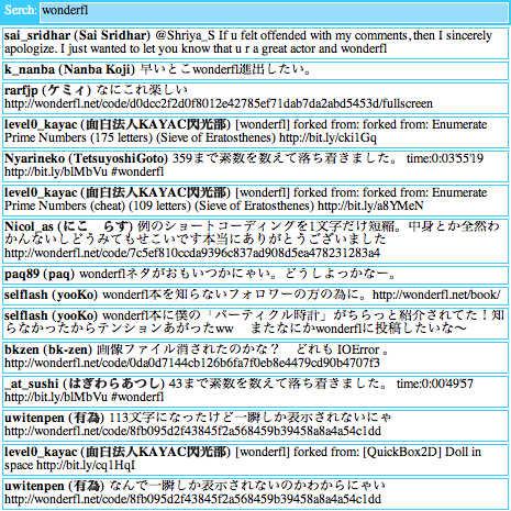 Twitter Search API Method: search * http://apiwiki.twitter.com/Twitter-Search-API-Method%3A-search * * Twitter API 仕様書 (勝手に日本語訳シリーズ) * http://watcher.moe-nifty.com/memo/2007/04/twitter_api.html *