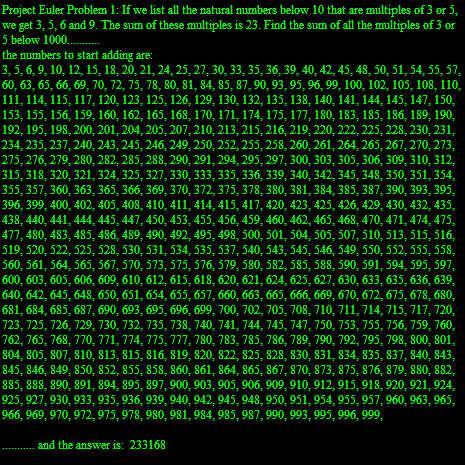 _t.appendText("Project Euler Problem 1: If we list all the natural numbers below 10 that are multiples of 3 or 5, we get 3, 5, 6 and 9. The sum of these multiples is 23. Find the sum of all the multiples of 3 or 5 below 1000...........\n");