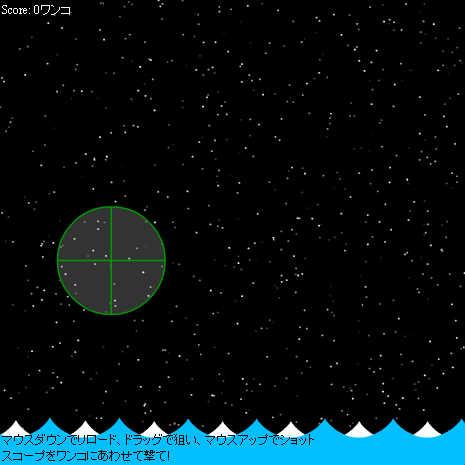 @OKASUKE *β版なので7匹まで、14匹はお手軽さがないなぁ。。。 *iPhoneに移植できそうなタッチ&リリース *10/22バグ修正中・・・注:まだバグあります。 *10/23完成予定・・・バグはなくなったかと。。。ソースは汚いが・・・ * *参考 betweenas3Demo beinteractiveさんhttp://wonderfl.net/code/6c19a0f54ef69d3095743b293e55ce3e93e8b3c6 *背景 paqさんhttp://wonderfl.net/code/8a1d2f7fd87a599f525166c8d5380fa04864dff0 *説明:マウスダウンでリロード画面上に *「リロード完了 The loading is completed.」メッセージ表示で射撃可能 * ドラッグでスコープ移動し、ワンコを狙って撃てっ!