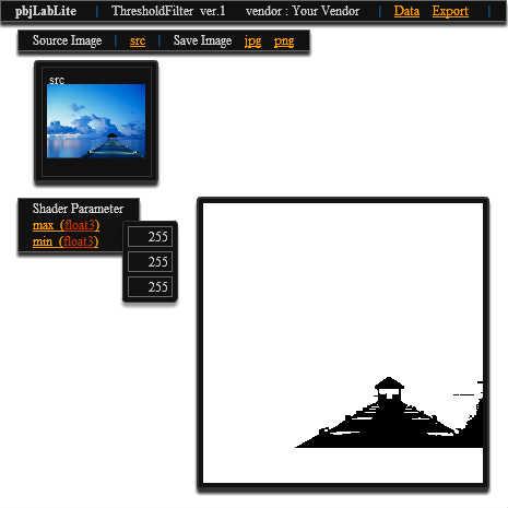 * RGB値の最大・最小を入力し、その条件にあてはまるか否かで2値化するフィルタです。