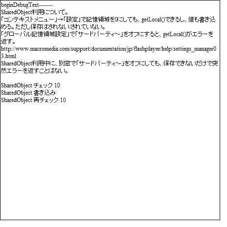 addDebLine("SharedObject利用中に、別窓で「サードパーティ~」をオフにしても、保存できないだけで突然エラーを返すことはない。");