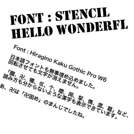 tx2.text = "Font : Hiragino Kaku Gothic Pro W6\n\n日本語フォントも無事埋め込めました。\n回転させても文字が消えません。\n\n「朧、卍、犧、巛、个、嚶、网、挈、儁、潺、鼈」など、\n読み方も分からないような漢字も表示できています。\n\nあ、卍は「卍固め」のまんじでしたね。";