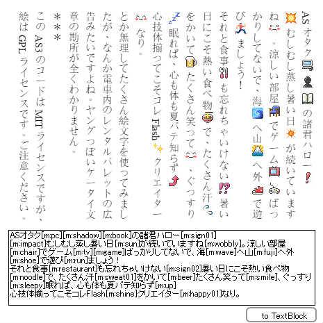 inputTF.text = "ASオタク[m:pc][m:shadow][m:book]の諸君ハロー[m:sign01]\n[m:impact]むしむし蒸し暑い日[m:sun]が続いていますね[m:wobbly]。涼しい部屋[m:chair]でゲーム[m:tv][m:game]ばっかりしてないで、海[m:wave]へ山[m:fuji]へ外[m:shoe]で遊び[m:run]ましょう!\nそれと食事[m:restaurant]も忘れちゃいけない[m:sign02]暑い日にこそ熱い食べ物[m:noodle]で、たくさん汗[m:sweat01]をかいて[m:beer]たくさん笑って[m:smile]、ぐっすり[m:sleepy]眠れば、心も体も夏バテ知らず[m:up]\n心技体揃ってこそコレFlash[m:shine]クリエイター[m:happy01]なり。\nとか無理してたくさん絵文字を使ってみましたが、なんか電車内のレンタルパレットの広告みたいですよね。ヤングっぽいケータイ文章の勘所が全くわかりません。\n***\nこのAS3のコードはMITライセンスですが、絵はGPLライセンスです。ご注意ください。";