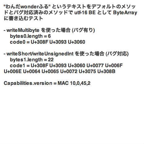 _textField.text = '"' + text + '" というテキストをデフォルトのメソッドとバグ対応済みのメソッドで utf-16 BE として ByteArray に書き込むテスト' + '\r' +