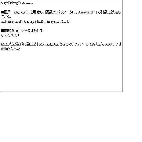 addDebLine("\nAS2.0だと逆順に設定される(f,e,d,c,b,a となる)のでテストしてみたが、AS3.0では正順となった");