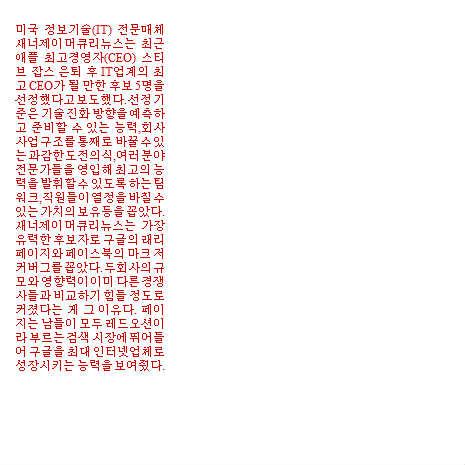 새너제이머큐리뉴스는 가장 유력한 후보자로 구글의 래리 페이지와 페이스북의 마크 저커버그를 꼽았다. 두 회사의 규모와 영향력이 이미 다른 경쟁사들과 비교하기 힘들 정도로 커졌다는 게 그 이유다. 페이지는 남들이 모두 레드오션이라 부르는 검색 시장에 뛰어들어 구글을 최대 인터넷업체로 성장시키는 능력을 보여줬다.";