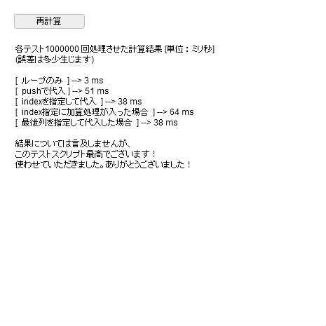 "各テスト" + _NUM_TIMES.toString() + " 回処理させた計算結果 [単位 : ミリ秒]\n" +