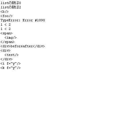 var fancy:XML = <div>{'before' + <test/> + 'after'}</div>;