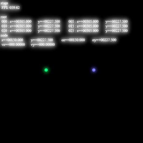 クラス化 - isRunning - toText バネの根元を表現するクラス - springRootSprite マウスボタンを押している間、バネの束縛を受けない - xPres - xReles - isPulled ( ボタンが効かない時がある ) 直近300フレーム分のspringRootSpriteの位置を保存し、6フレーム分をピックアップして表示 形式は nフレーム前:x位置,y位置 - _storeState FPSを表示 - xTimer - FPS_REFRESH_RATIO FPSの数値を更新する頻度(回/秒) 初期化部分の修正 画面内のどこかをクリックするとバネの運動を開始する - xActivateRoot sprintfにパッチ - floatのゼロ埋めフラグ(flagZeroPad)が無効だった仕様を修正