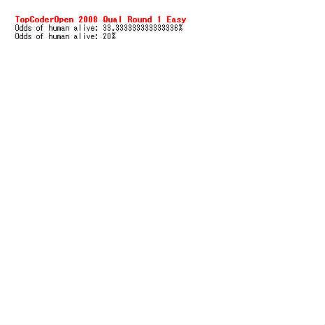 public function oddsHumanSurvive(M:uint,B:uint):String {
