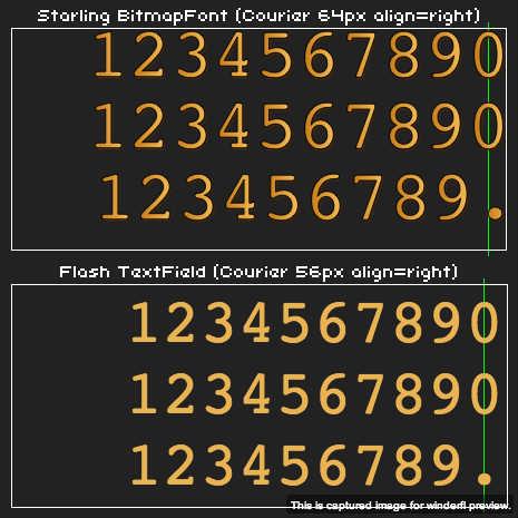 var label2:TextField = new TextField(445, 16, "Flash TextField (Courier 56px align=right)", BitmapFont.MINI, BitmapFont.NATIVE_SIZE * 2, 0xFFFFFF);