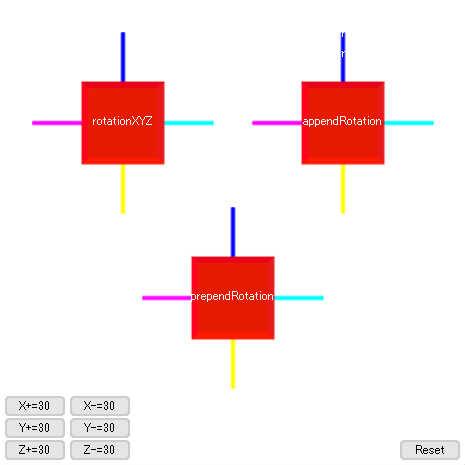★ジンバルロックを体験してみよう!3 * * 0.左上のrotationXYZの立方体に注目 * 1.初期状態(又はReset後)に「Y+=30」を三回クリックして、 * Y軸90度回転をする。 * 2.「Z+=30」をクリックしてみる。Z軸回転したことを確認。 * 3.「Z-=30」をクリックして戻す。 * 4.「X-=30」をクリックすると、、、アレレ!「Z+=30」と同じ * Z軸回転しちゃうぞ! * これがジンバルロックであります。 * いろいろ回転させていろいろ試してくださいませ。 * * ============================= * * AS3.0(FP10)のビルトイン関数における、 * rotationX,appendRotation,prependRotation * の使い分け。Pepervision3D(PV3D)との比較。 * * PV3D版★ジンバルロックを体験してみよう! * http://wonderfl.net/code/2d5664a811359bb65aeebb97422f4668250a74c9 * と見比べながら読むことを推奨。 * * * まずそもそも、X,Zをクリックした時の回転方向が異なることに注目。 * これは、PV3Dが左手系、ビルトイン関数では右手系であることによる違い。 * 正確にはX,Zが違うというより、Yが逆になっている。 * PV3Dは既存のグラフィック系3Dソフトのセオリーに従った結果、 * ビルトイン関数の方は、なによりこれまでのFlashの体系を優先させた結果だと思う。 * * * ■rotationXYZ * 簡単なものなら、rotationXで足りるものもあるんだろうけど、 * 自在に回転させるとなると、どうしてもジンバルロックが問題になる。 * 値がわかりやすいってのが強み。 * PV3DのrotationXYZに相当(名前も同じだから間違えないね!)。 * * ■appendRotation * 内部的にはQuaternionを使っているので、ジンバルロックが無い。 * PV3DのQuaternionに相当。 * * ■prependRotation * 内部的にはQuaternionを使っているので、ジンバルロックが無い。 * PV3DのlocalRot