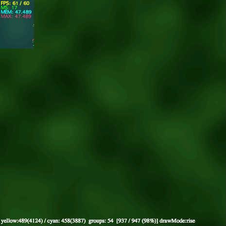 mouse drag 地形スクロール click 地形隆起/沈降 [space] 上記隆起/沈降トグル [enter] 地形リセット [r] パーティクルリセット Ver.4 同色パーティクル同士のグループ化をおこなうようにした。 前よりは束同士がもみ合う感じになってるかと。 地形は表示するように変更した。 色々地形周りを操作できるようにした。多少は紛争っぽく演出できるかも 下の数字は、"各色パーティクル数(パーティクルHPの合計) グループ数 [パーティクルのグループ所属率] マウスクリックの描画モード" となっております。 とりあえず次は地形の回転をいれようか。 ---------------------------------- コードが試行錯誤の跡そのままでぐちゃぐちゃw。機能面が落ち着いたら綺麗にしたい