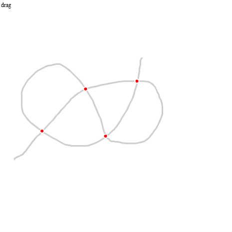 マウスで引いた線を立体にする * マウスを押して動かしている間線を描いて * マウスを離したら3D化 *---------------------------------------- * 交点を検出して表示します。 * Special Thanks uwiさん *---------------------------------------- * ToDo 陰影をつける * 3D描画時に交点情報を入れる * 透視投影にする * 余分な頂点を割愛する * etc. etc...