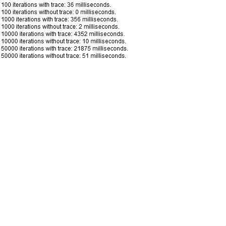 textfield.appendText(loopcount + " iterations without trace: " + (endTime-startTime) + " milliseconds.\n");