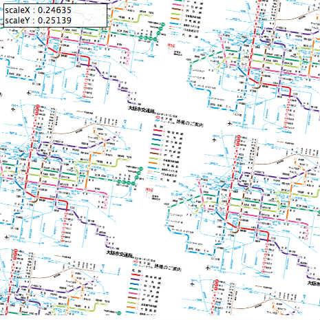 ------------------------------------------------- ミップマップでビットマップの縮小 画像は大阪市交通局から勝手にお借りしてます。 100%より小さく、少しずつ姿勢を変化させ続けたときに ビットマップがどのように描画されるかを確認するテストです。 マウスホイール回転で拡大縮小が可能です。 -------------------------------------------------