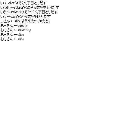 tf.appendText(str.slice(1,3) + " ←sliceで2~3文字目とりだす\n");