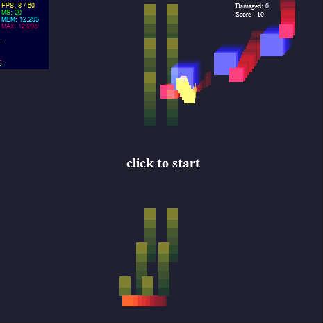 // 敵(青・赤・紫)に当たり判定ないです。弾(白・黄色)だけ当たります