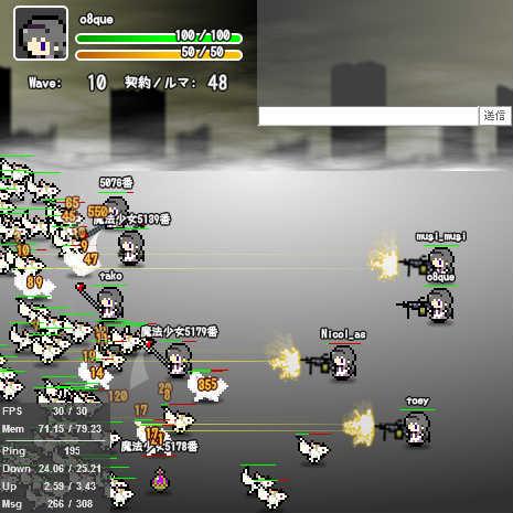release version (完成版) http://wonderfl.net/c/3VrR [controls] Arrow: movement (矢印キー: 移動) z: attack (攻撃) x: reload (リロード) c: swap weapon (武器切り替え)