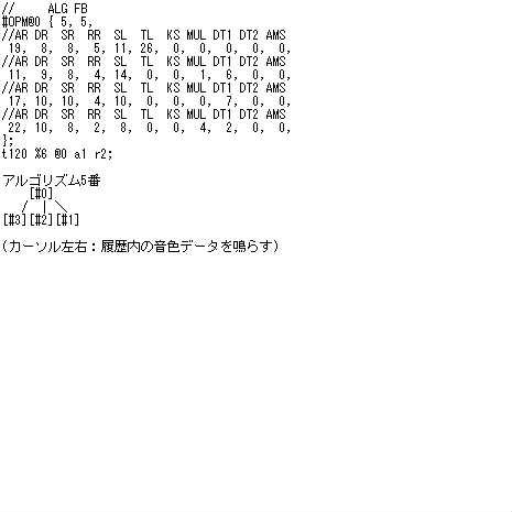 mml = makeMml(td); //FM音色データ配列を元に、SiON演奏用MMLを生成する