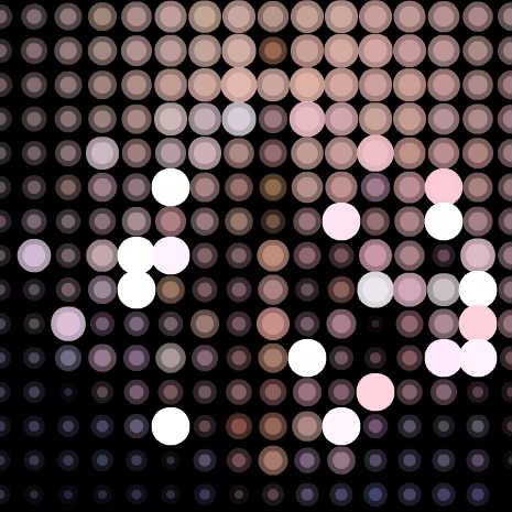 ウェブカメラからの映像をドットに反映させます。これを作った時点ではFlashPlayer9での書き出しで作ったためVectorクラスは使用していません。同じく色も現時点ではBitmapData.histogramで色をとっているわけではありません。明度を調べてドットのサイズを調整します。
