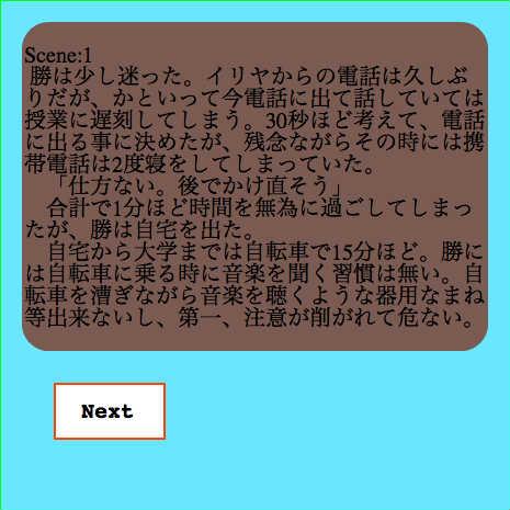 private var ms1_1:Array = [" 2010年5月13日\n\n 雨が降るとも振らないともはっきりしない今日の天気は5月らしいと言えば5月らしく、しかし、関口勝の気分は正に5月病を色を呈していた。\n 関口勝。性別は男。今年大学に入学したての1年生。\n 新しい環境に胸を膨らませていた彼であったが、現実は彼の期待には比例せず、新しくも刺激の無い生活を提供していた…",