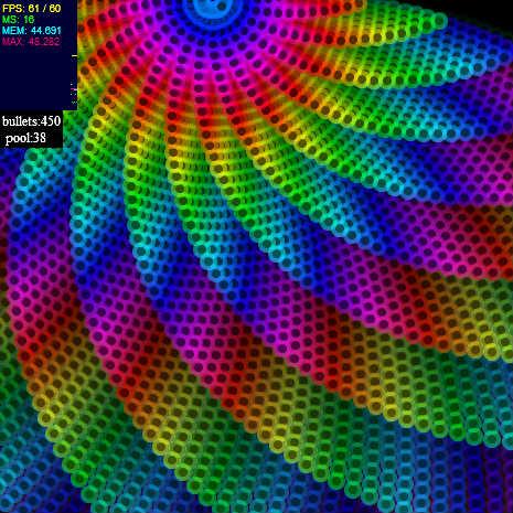 コードのリファクタリング & 最適化 Nicolasが最適化してくれました。 http://wonderfl.net/code/63f88f2189846bdc7275a01d5d228b1607344e51 BitmapData#draw() を BitmapData#coloyPixces() に変えるだけ! めっちゃ早いよ!これ! by coppieee さらに最適化! http://wonderfl.net/code/9dcd5e428a43c4b20f69f86873f2831fa9ec32f3 に触発されて、私も最適化してみた。Linked listは使いたくなかったので別の方法で。 これでもか!ってぐらいがんばった。 Particleのプール用意して、 削除のところ工夫して、 回転の計算のアルゴリズム変更して、 とかもろもろ。 弾の大きさを変更したのはオマケ。(オマケなんだけど、小さければ小さいほど速くなるよ。) きっとこれ以上の最適化は無理だと思うよ! _canvas.copyPixels()のところを別の描画のアルゴリズムで置き換えたら、あるいはもっと速く・・・。 by coppieee 凝視注意