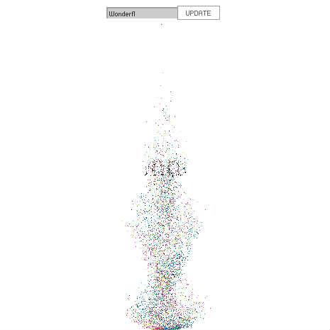 こんな感じですか??getColorBoundsRect多用してしまったので重いかも。。 煙は正直サボりました ////////////////////////////////////////////////////////////////////////////// DotWind 砂が竜巻のような動きで舞い上がって、文字を構成し、 すべての文字が表示された後、文字が煙のように消えて行く ...ようにしたいの。 (現状は、砂が舞い上がってるだけ) [竜巻のような動きは3Dっぽくない方がいい] //////////////////////////////////////////////////////////////////////////////