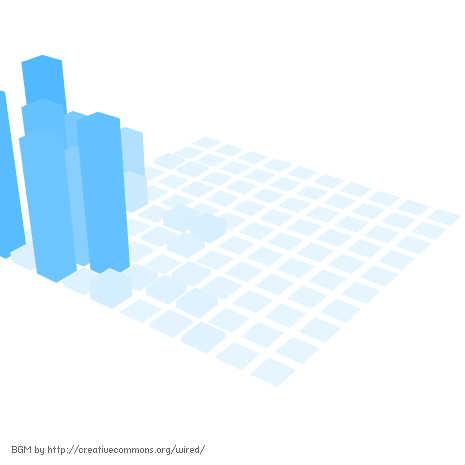 3Dのイコライザー。 * Zソートだとポリゴン欠けが目立ったので、インデックスソートに変更。 * カメラとの距離で毎フレームインデックスを変更してます。 * * BGMは http://creativecommons.org/wired/ を使用させていただきました。