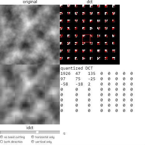 - perform DCT for each 8x8 block - luminance quantization applied (using standard Q table) - you can zero from highest frequencies in 8 steps (use slider and buttons at bottom) dct image is highly oversaturated because all values other than DC term is too low. red pixel means negative frequency value.