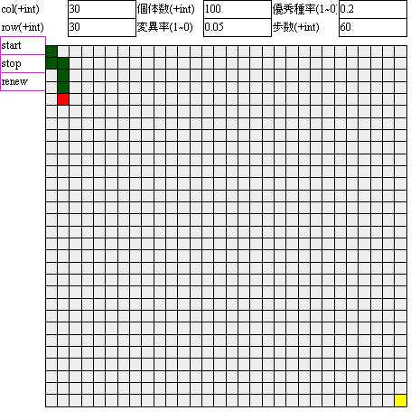lblCol.text ="col(+int)"; lblRow.text ="row(+int)"; lblCount.text ="個体数(+int)"; lblMut.text ="変異率(1~0)"; lblTop.text ="優秀種率(1~0)"; lblOdr.text ="歩数(+int)";