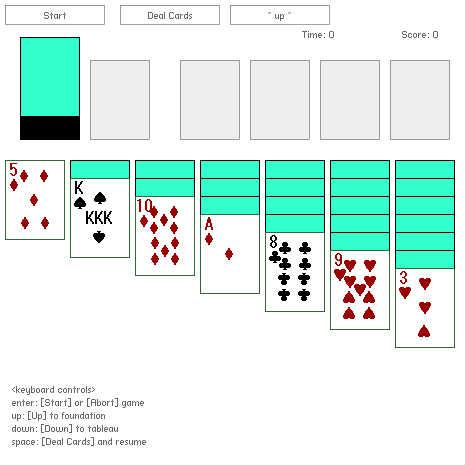 エクストリーム・ソリティア あそびかた [Enter]キーでゲームを始めると山札のカードを自動的にめくって どんどん場に下ろしたり右上に移動したりします ・[↓]を押すと一時的に右上から場に下ろすモードになります ・[↑]を押すと右上にどんどん重ねていくモードに戻ります ・[スペース]を押すと全てをあきらめてカードを配りなおします 一分間で3回くらいクリアできるはず 細かい操作ができない上にあまり頭も良くないので 時々本来クリアできる配置がクリアできなかったりします 考えないで配りなおしてください @author kaikoga