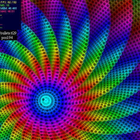 コードのリファクタリング & 最適化 * Nicolasが最適化してくれました。 * http://wonderfl.net/code/63f88f2189846bdc7275a01d5d228b1607344e51 * BitmapData#draw() を BitmapData#coloyPixces() に変えるだけ! * めっちゃ早いよ!これ! * by coppieee さらに最適化! * http://wonderfl.net/code/9dcd5e428a43c4b20f69f86873f2831fa9ec32f3 * に触発されて、私も最適化してみた。Linked listは使いたくなかったので別の方法で。 * これでもか!ってぐらいがんばった。 * * Particleのプール用意して、 * 削除のところ工夫して、 * 回転の計算のアルゴリズム変更して、 * とかもろもろ。 * * 弾の大きさを変更したのはオマケ。(オマケなんだけど、小さければ小さいほど速くなるよ。) * きっとこれ以上の最適化は無理だと思うよ! * * * _canvas.copyPixels()のところを別の描画のアルゴリズムで置き換えたら、あるいはもっと速く・・・。 * by coppieee 凝視注意