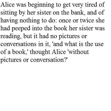 tf.text = "Alice was beginning to get very tired of sitting by her sister on the bank, and of having nothing to do: once or twice she had peeped into the book her sister was reading, but it had no pictures or conversations in it, 'and what is the use of a book,' thought Alice 'without pictures or conversation?'"
