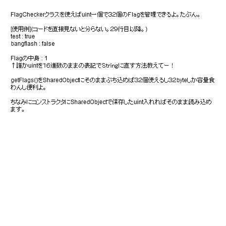 _debug("FlagCheckerクラスを使えばuint一個で32個のFlagを管理できるよ。たぶん。");