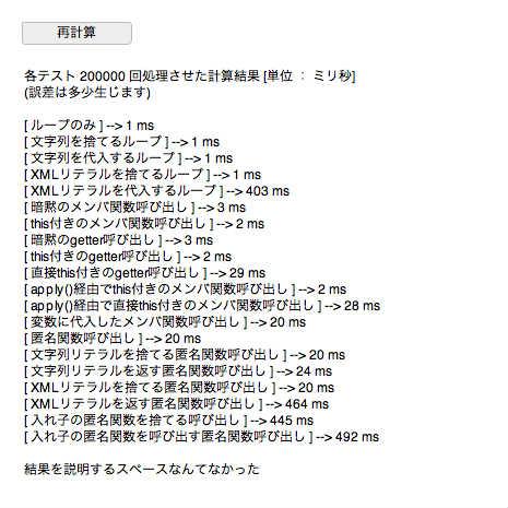 "各テスト " + _NUM_TIMES + " 回処理させた計算結果 [単位 : ミリ秒]\n" +
