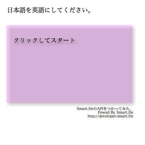 英語の勉強とかなんとかw クリックで問題と解答の切り替え 日本語を英語にしなさい的な〜。 試しにsmart.fmのAPIを利用してみた。 メモ http://smart.fm/ http://developer.smart.fm/docs/Sentence_calls/search_sentences