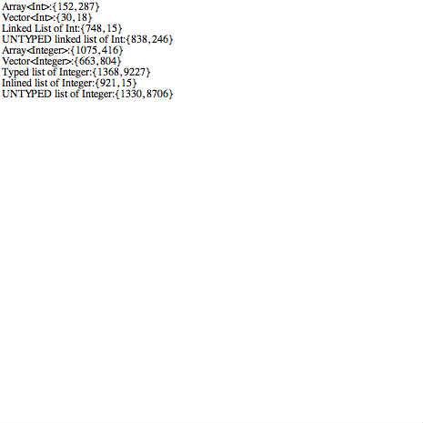//var sum:int = 0; for each(var j:Integer in list6) sum += j.elt; //Ave = 125ms
