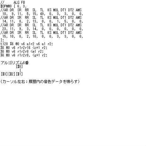 mml = makeMml(td); //FM音色データ配列を元に、SiON演奏用MMLを生成する