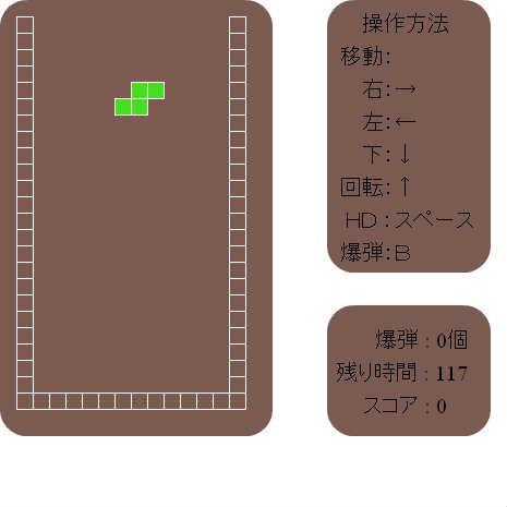 ここで使用しているコードはPoisonCodeさんのところで紹介されている物を 引用させていただいています PoisonCode→http://poisoncode.blog77.fc2.com/ 操作方法は書いてあるとおりです。 ちなみにHDはハードドロップの略。 行を消すと消した行数に応じてお邪魔テトリミノが出現します。 一度に多くの行を消せばより多くのスコアを稼げますが、 同時によりやっかいなお邪魔テトリミノが出現します。 お邪魔テトリミノにめげずに高得点を目指してください。 爆弾を使用すると落下中のテトリミノを爆破できます。 爆弾は特定ポイントを稼ぐ毎に一個追加されます。 *注意*HDが動かないと言う方 半角で操作してください。全角だと動きません 目標:透過ブロックの生成 2画面対戦可能化 対戦用CPUのAI構築 通信対戦可能化 BGM,SEの追加 ビットマップ使用 その他諸々のアニメーション追加