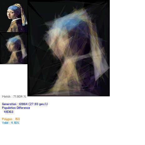 1. mutate parent(add random polygon or delete, change color, alpha) - make child 2. compare with original image 3. if child's fitness is better than parent, child is parent. 4. go to 1 Reference - http://linesandcolors.com/2008/12/10/genetic-programming-evolution-of-mona-lisa/ p.s. : it takes a lot of time to see a good image..