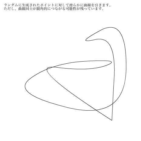 tex.text = 'ランダムに生成されたポイントに対して滑らかに曲線を引きます。\nただし、曲線同士が鋭角的につながる可能性が残っています。';
