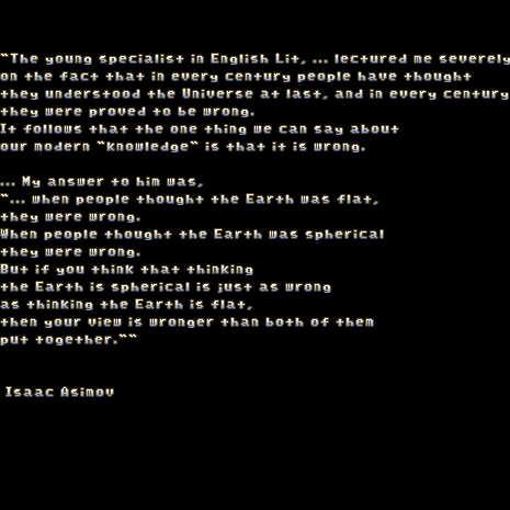 addChild(new Bitmap(_bitmapFont.returnBitmapText('\n\n\n"The young specialist in English Lit, ... lectured me severely\non the fact that in every century people have thought\nthey understood the Universe at last, and in every century\nthey were proved to be wrong.\nIt follows that the one thing we can say about\nour modern "knowledge" is that it is wrong.\n\n... My answer to him was,\n"... when people thought the Earth was flat,\nthey were wrong.\nWhen people thought the Earth was spherical\nthey were wrong.\nBut if you think that thinking\nthe Earth is spherical is just as wrong\nas thinking the Earth is flat,\nthen your view is wronger than both of them\nput together.""\n\n\n Isaac Asimov')));