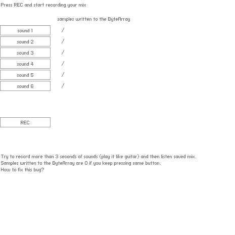 var info:Label = new Label(this, 0, 300, "Try to record more than 3 seconds of sounds (play it like guitar) and then listen saved mix.\nSamples written to the ByteArray are 0 if you keep pressing same button.\nHow to fix this bug?");