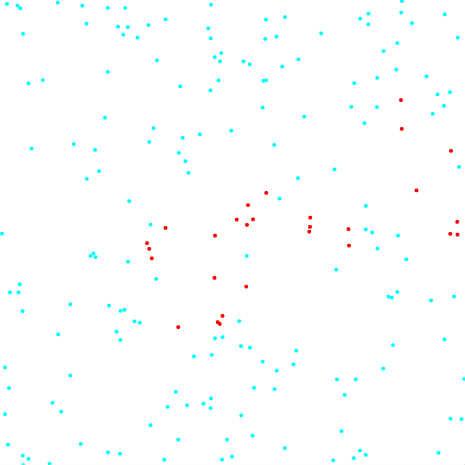 //赤が感染者で半径5pxの中に入ると一定の割合で感染します