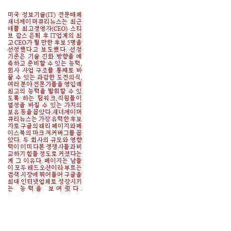 새너제이머큐리뉴스는 가장 유력한 후보자로 구글의 래리 페이지와 페이스북의 마크 저커버그를 꼽았다. 두 회사의 규모와 영향력이 이미 다른 경쟁사들과 비교하기 힘들 정도로 커졌다는 게 그 이유다. 페이지는 남들이 모두 레드오션이라 부르는 검색 시장에 뛰어들어 구글을 최대 인터넷업체로 성장시키는 능력을 보여줬다.";