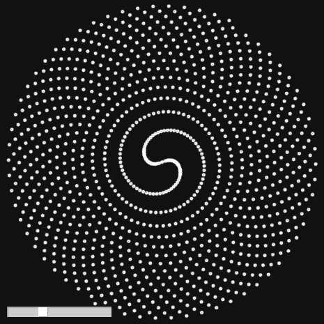 you perceive that particles move to center but this is just illusion. move the slider to change the roatation speed. 超高速回転させると吸い込んでいるように見える!