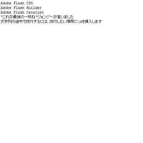 trace("Adobe Flash CS5\nAdobe Flash Builder\nAdobe Flash Catalyst");